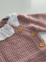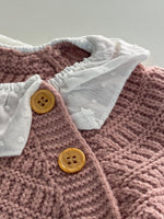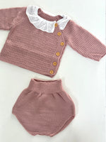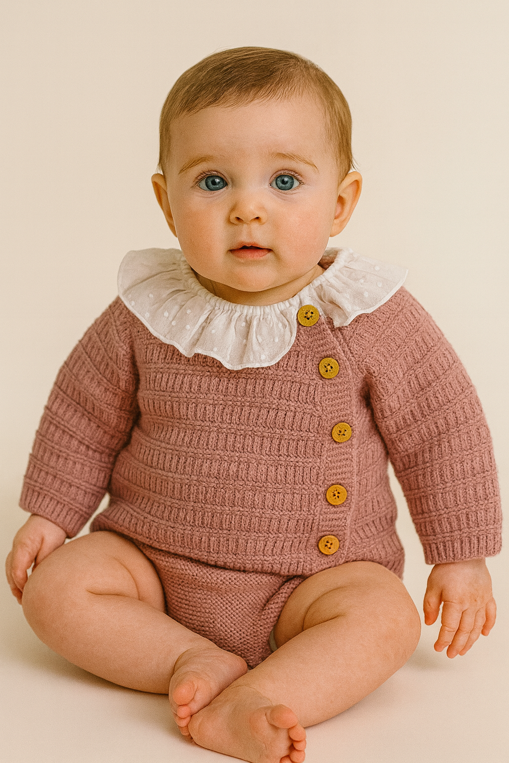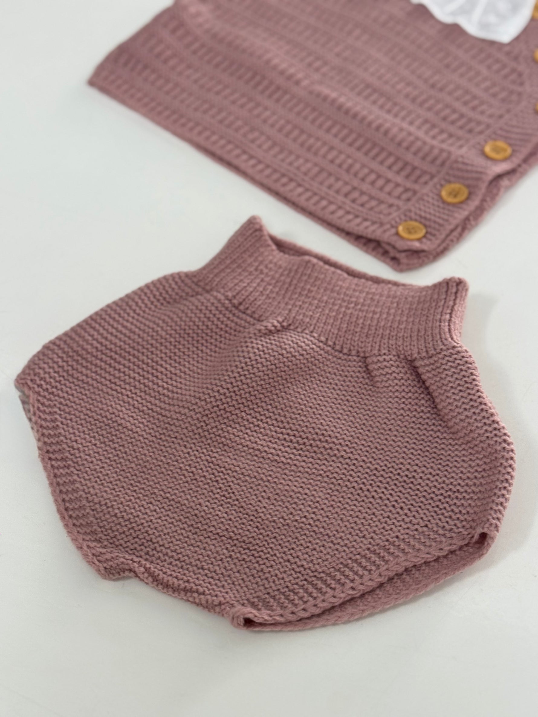 Estilo europeo y con un cuello de encaje encantador que roba miradas, inspirado en la elegancia atemporal, el set tejido está confeccionado en algodón fino con punto calado en patrón de espiga que aporta textura y distinción. En la parte superior del set tenemos la blusa con botones en madera en la parte del cuello, y su cuello con un bello encaje que le da un toque femenino y elegante, mientras que el parte inferior contamos con un short con una pretina elástica que se ajusta con suavidad y borde dorado que añade un toque sofisticado. Es un conjunto pensado para brillar en cualquier ocasión.